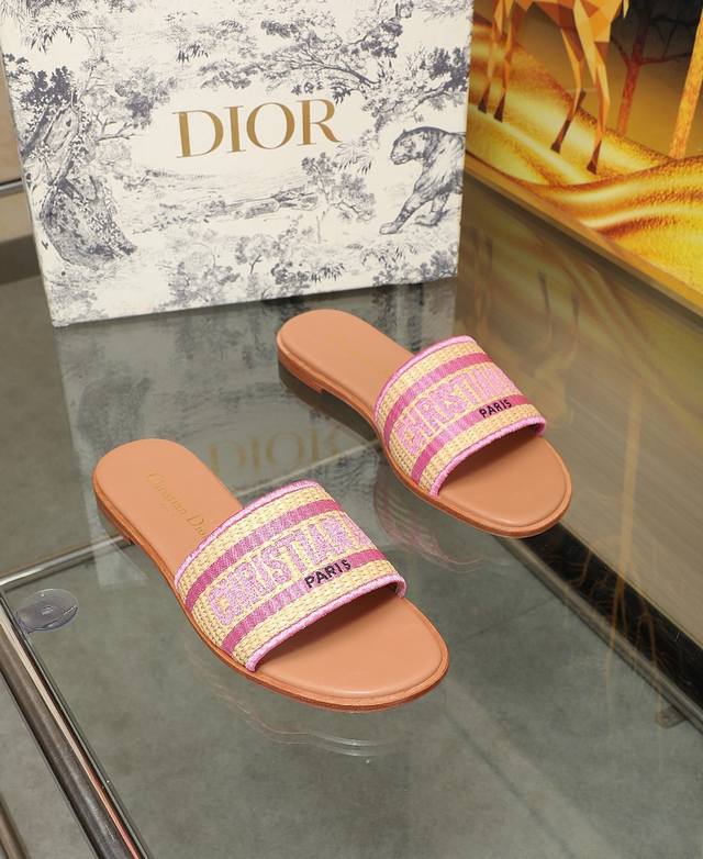 Dior迪奥平底一字拖鞋,草糖鞋面电绣编织,刺绣字母,内里垫脚羊皮。真皮大底,码数:35-42