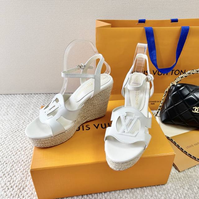 louis Vuitto L驴牌2025年新款 水波纹厚底坡跟凉鞋 草编高跟凉鞋